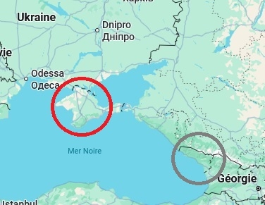 Ainsi, la Crimée est séparée du reste de l'Ukraine, mais pas le Donbass. Du côté de la Géorgie, l'annexion déguisée de l'Abkhazie par la Russie en 2008 n'est pas reconnue (pas plus que la pseudo-indépendance de l'Ossétie du Sud, située un peu plus à l'est).