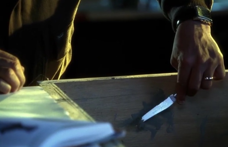 Il utilise ce qui ressemble à un couteau Laguiole, ce que confirme une vision retournée de ce plan :