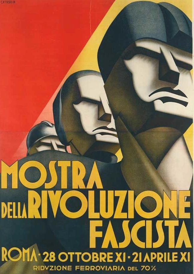 Ce célèbre tableau d'Alfredo Ambrosi glorifie Benito Mussolini, en 1930. Dans la même veine (fasciste), on trouve plusieurs affiches, comme celle-ci de 1932 :